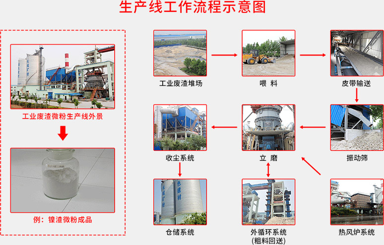 【工藝流程】堆放著的工業(yè)廢渣由鏟車取料、喂料,通過皮帶機(jī)進(jìn)行輸送。在輸送過程中,工業(yè)廢渣原料先后經(jīng)由除鐵器和振動(dòng)篩得到除鐵和篩分,然后通過稱重設(shè)備倉(cāng)、提升機(jī)進(jìn)入立磨機(jī)進(jìn)行粉磨。粉磨后的工業(yè)廢渣借助熱風(fēng)爐提供的熱風(fēng),通過選粉機(jī)進(jìn)行選粉,同時(shí)得到烘干。符合細(xì)度要求的工業(yè)廢渣微粉最后被輸送到收塵器收集、盛放后,由空氣輸送斜槽、提升機(jī)進(jìn)入成品庫(kù)中儲(chǔ)存。